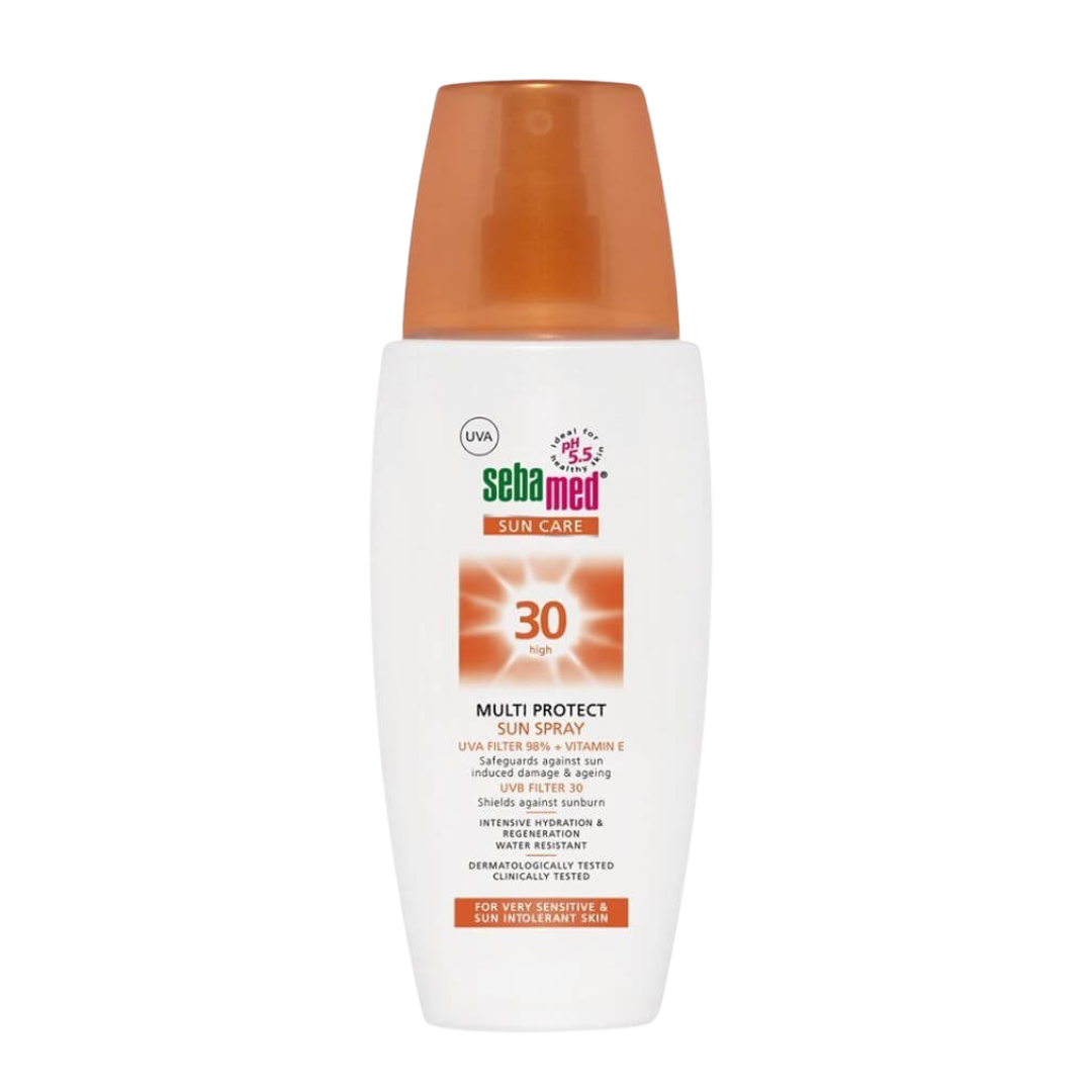 Sebamed Multi Protect Sun Spray UVA/UVB-Filter and Vitamin E safeguards against sun damage and ageing. Natural Inulin and Lecithin help to keep the sun-exposed skin smooth and firm to protect the elasticity of the skin. No parabens, no alcohol.Product